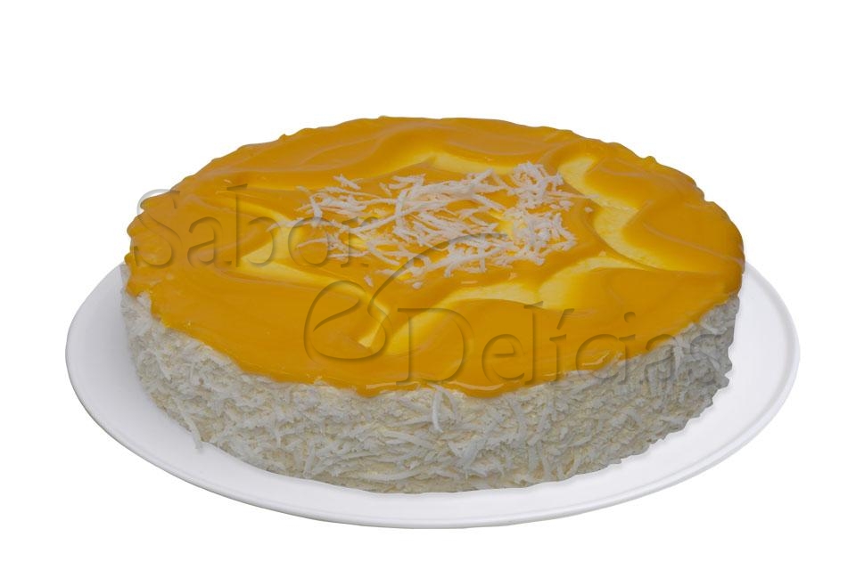 Pão de ló branco, recheado com abacaxi e coco, decorado com geléia de abacaxi e coco fresco.