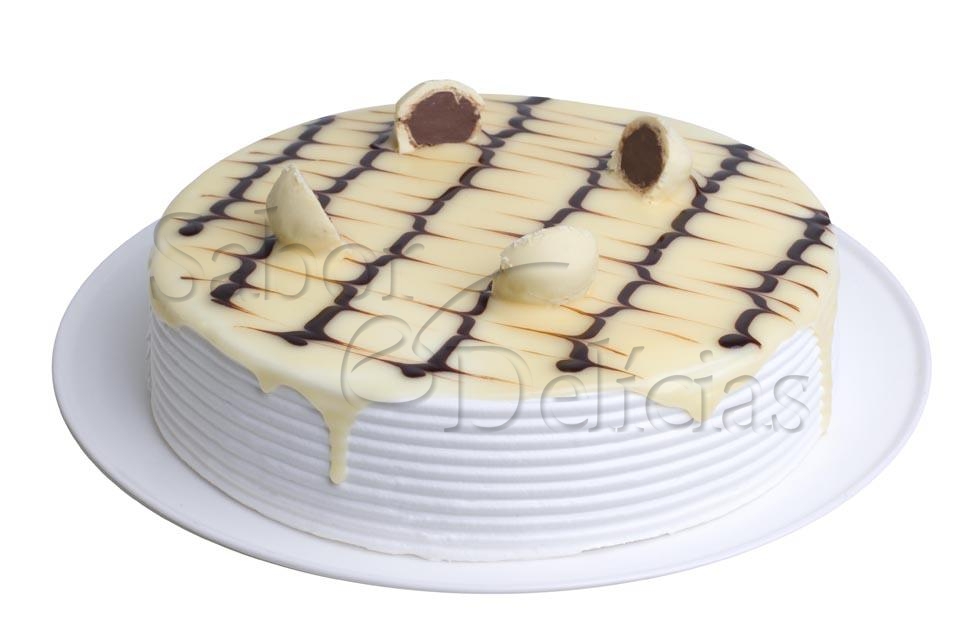Pão de ló branco, recheado com creme de baunilha e bombom, decorado com chantilly, ganache de chocolate branco e preto e bombom ouro branco.