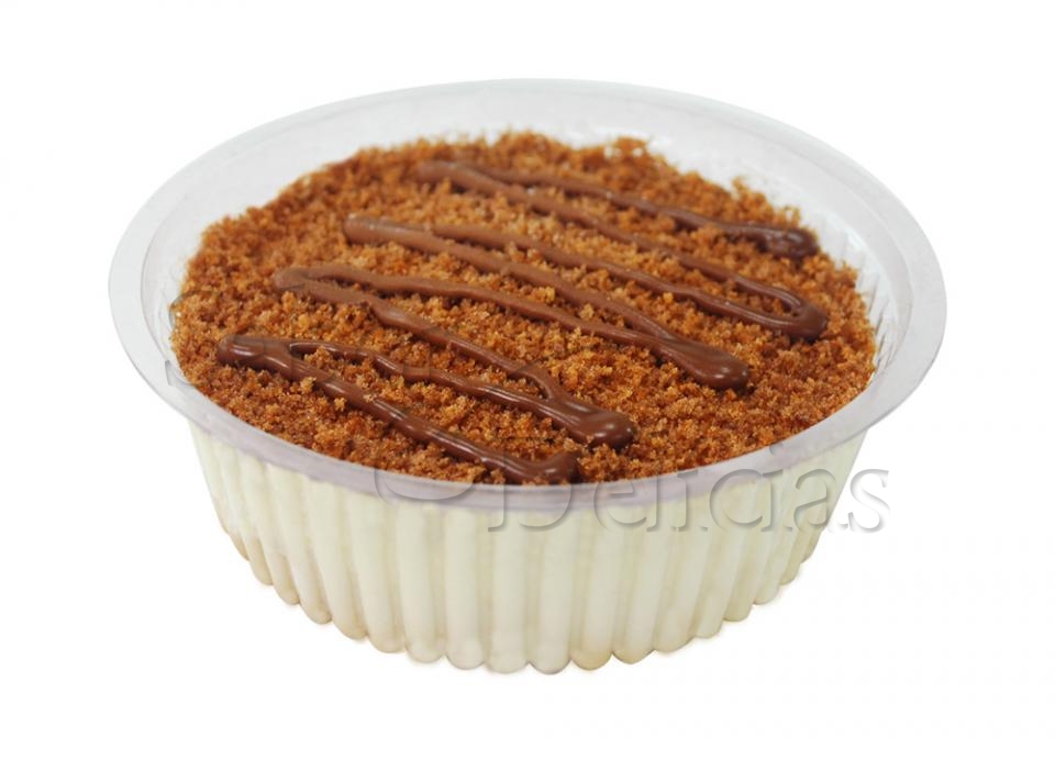 Pão de ló branco, banhado com calda de café, creme tipo mascarpone, decorado com farelo de bolo de chocolate.