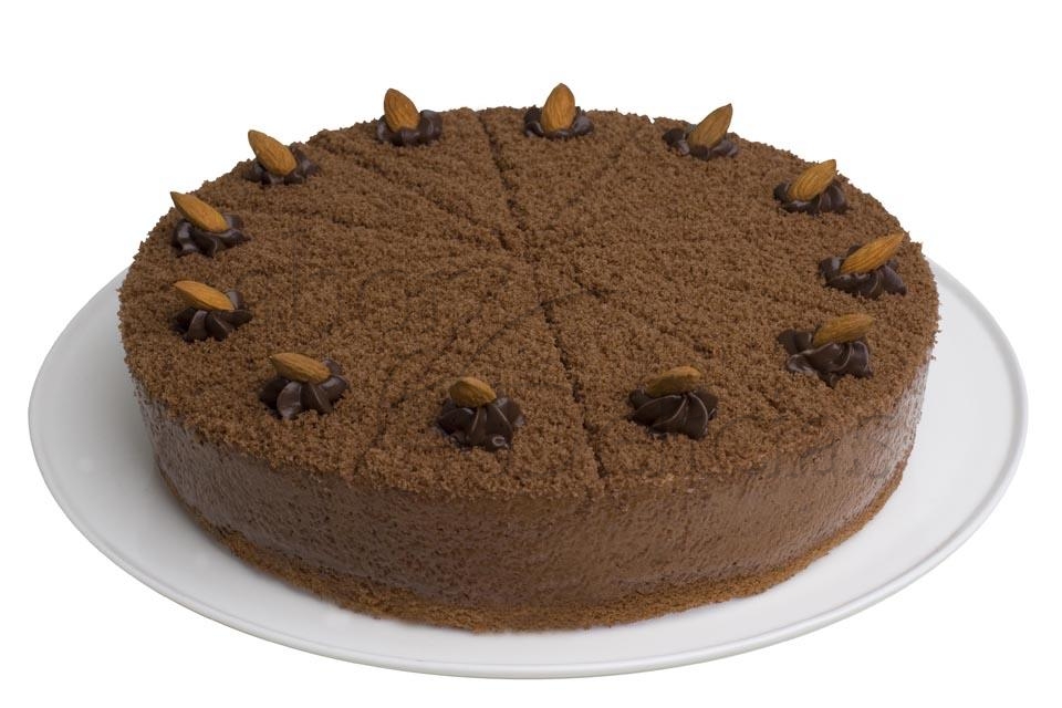 Fina camada de pão de ló de chocolate, com mousse de chocolate e amêndoas, decorado com farofa de pão de ló de chocolate e amêndoas inteiras.