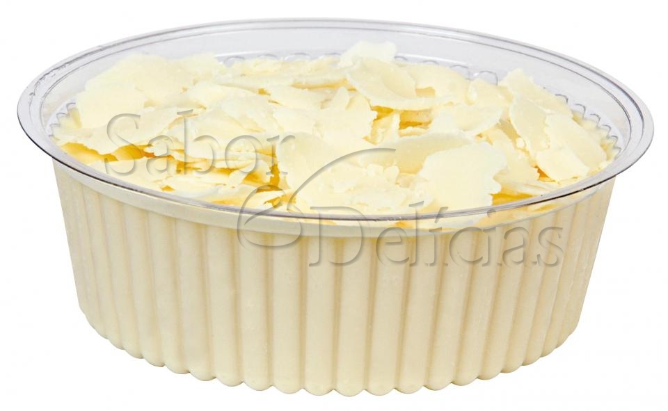 Delicioso mousse de chocolate branco, decorado com raspas de chocolate branco.