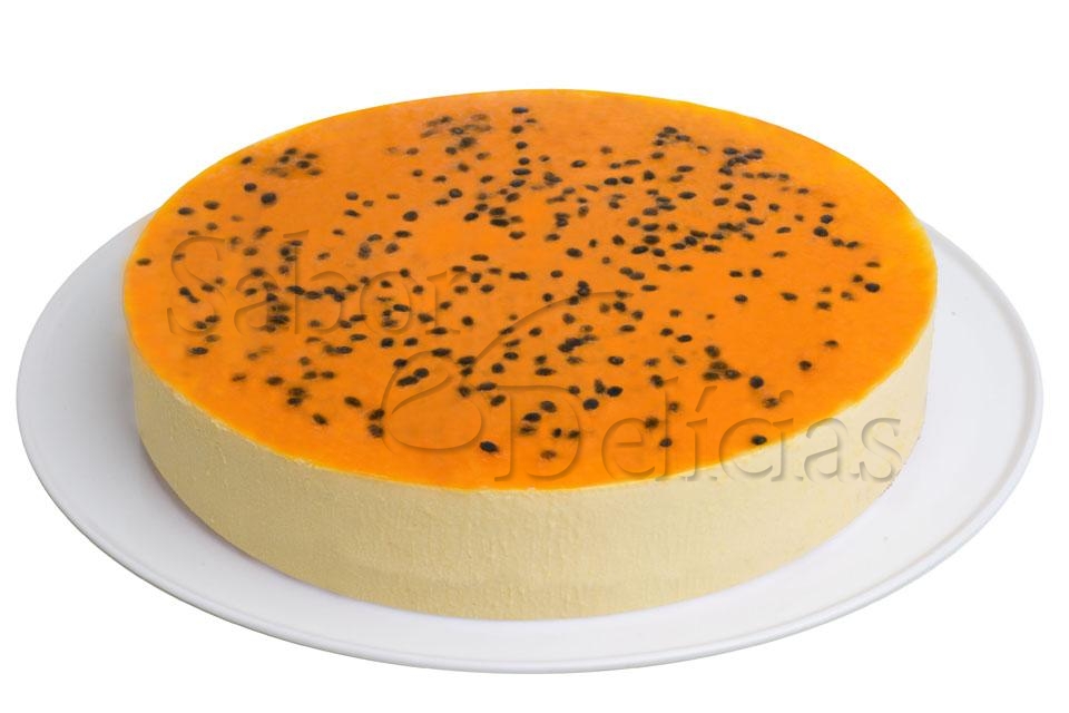 Fina camada de pão de ló branco, com delicioso mousse de maracujá, decorado com calda e sementes da fruta.