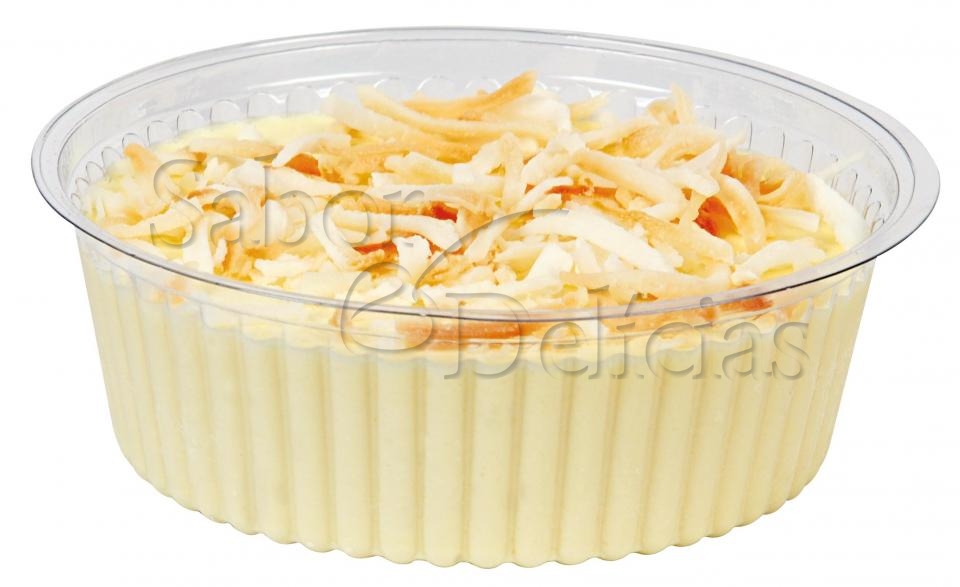 Pavê a base de creme de coco decorado com coco queimado desidratado.