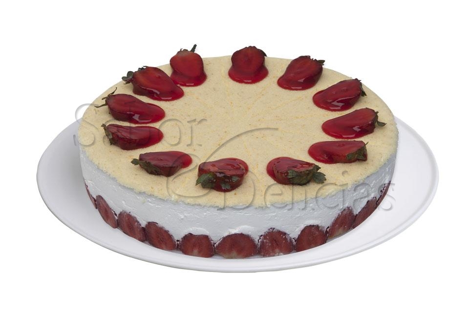 Pão de ló branco, recheado com pedaços de morango e chantilly. Decorado com farelo de pão de ló branco e com pedaços de morango.