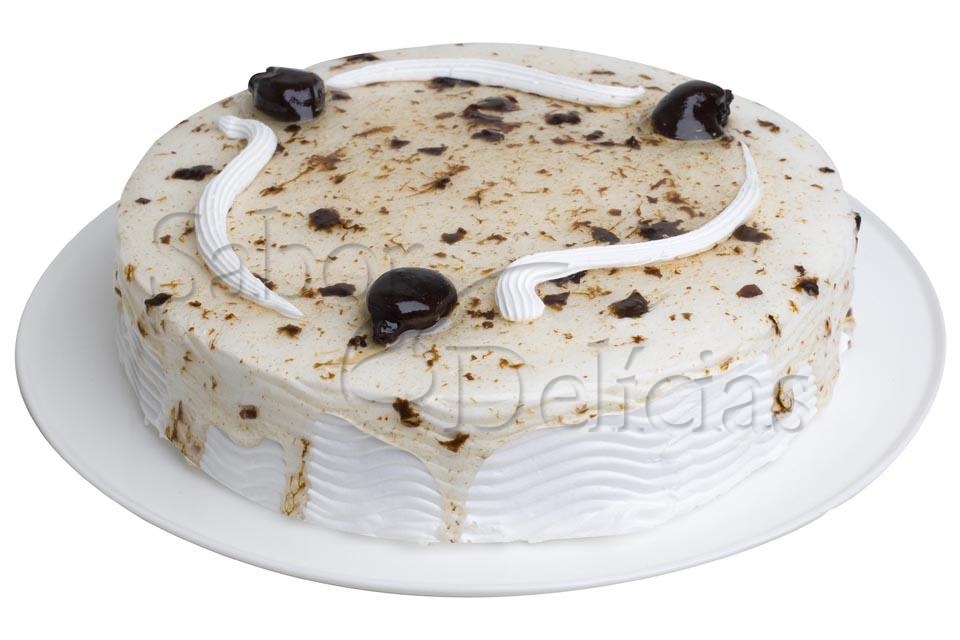 Pão de ló branco, recheado com creme de ameixa e chantilly, decorado com geléia e pedaços de ameixa.