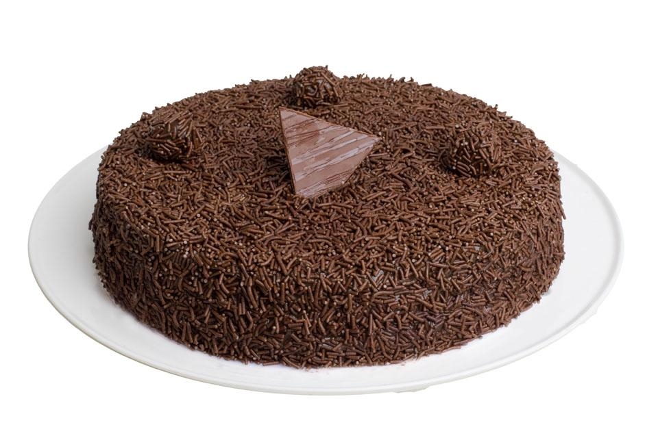 Pão de ló de chocolate, recheado e decorado com brigadeiro cremoso, decorado com chocolate granulado.