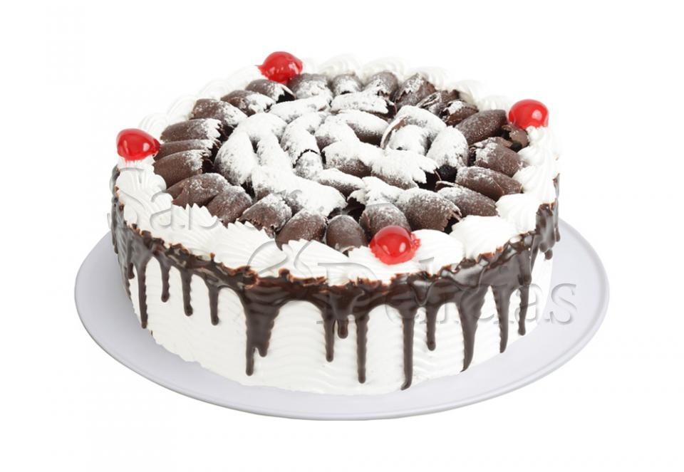 Pão de ló de chocolate, recheado com chantilly e cerejas picadas, decorado com raspas de chocolate e cerejas.