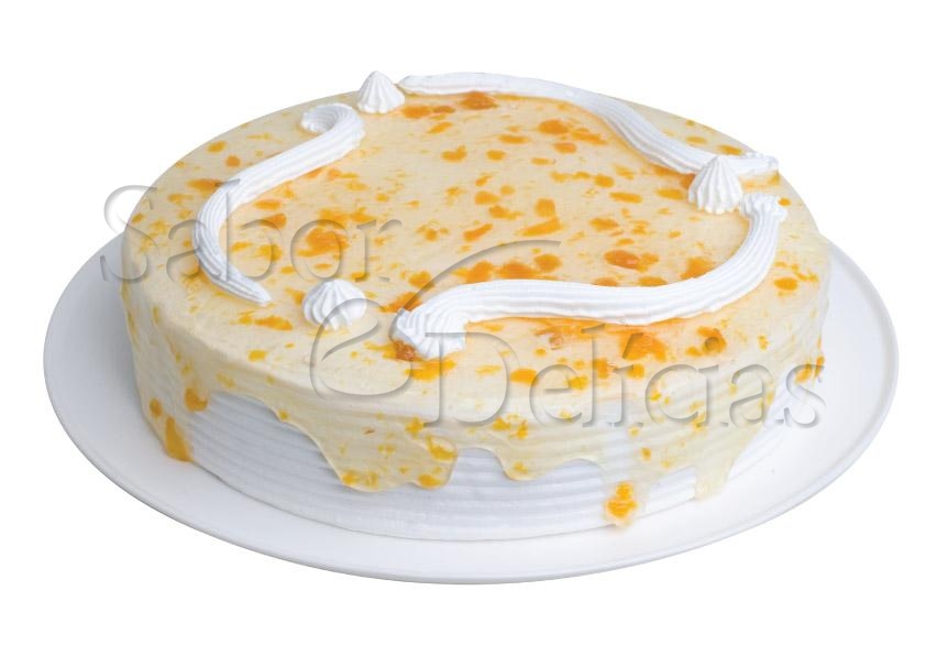Pão de ló branco, recheado com creme de pêssego e chantilly, decorado com geléia e pedaços de pêssego.