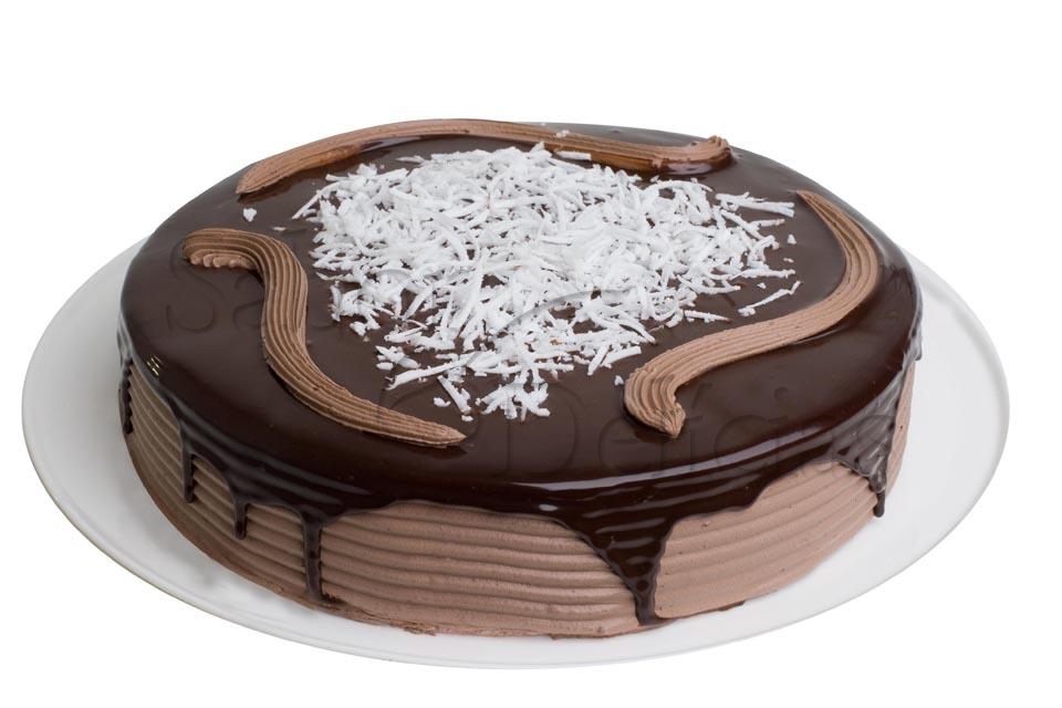Pão de ló de chocolate, recheado com creme de coco e decorado com calda de chocolate e coco.