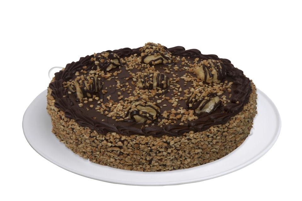 Pão de ló de chocolate, recheado com creme baunilha e xerém, confeitado com creme trufado e carolinas recheadas com chantilly.