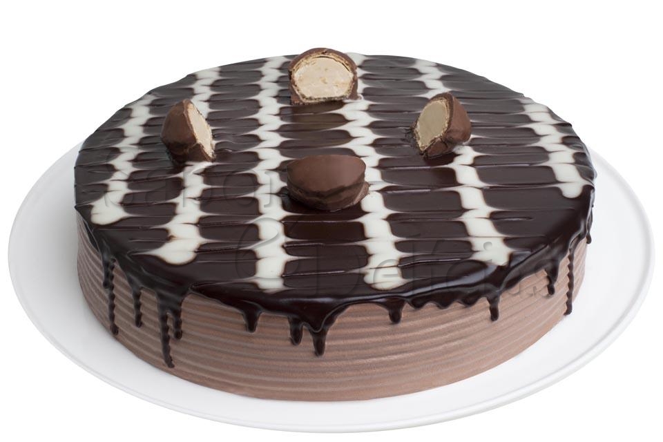 Pão de ló de chocolate, recheado com creme de chocolate e bombom, decorado com chantilly de chocolate, ganache de chocolate branco e preto e bombom sonho de valsa.