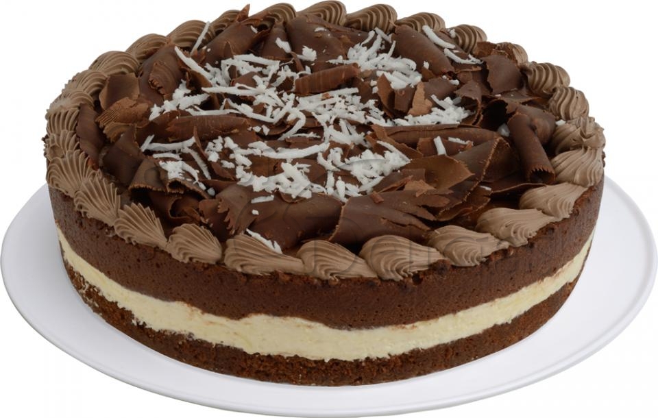 Fina camada de pão de ló de chocolate, com delicioso mousse de chocolate meio amargo, recheado com creme de coco, decorado com raspas de chocolate e coco.