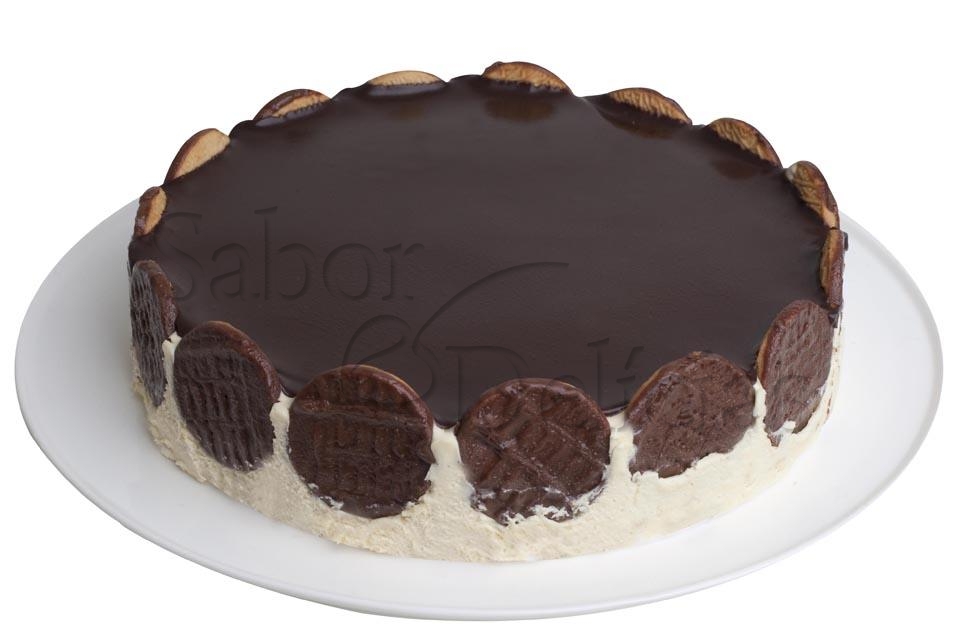 Torta a base de creme holandês, intercalado com biscoito tipo maria, decorada com ganache e biscoitos de chocolate tipo calypso na lateral