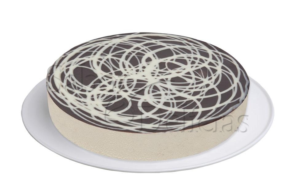 Pão de ló de chocolate, recheado com trufa e creme de baunilha, coberto com calda de chocolate preto e branco.