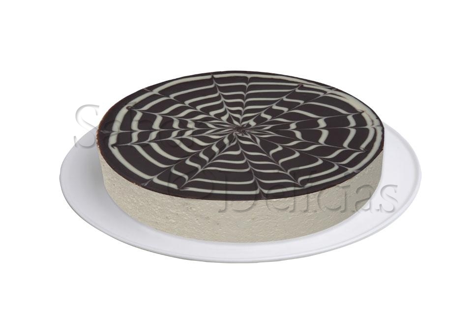 Fina camada de pão de ló de chocolate com mousse de coco coberto com calda de chocolate preto e branco.